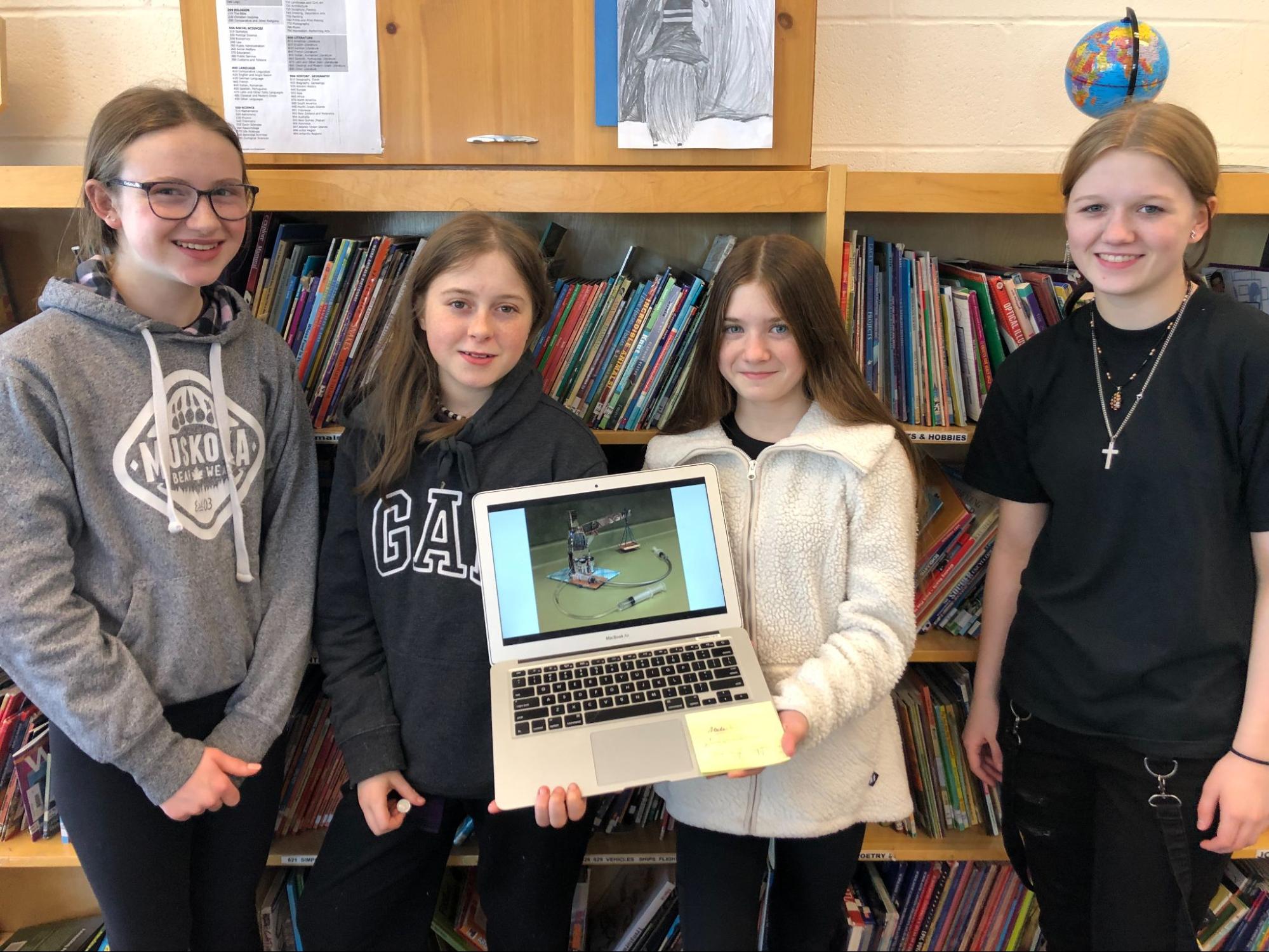 Grade 8 students at Muskoka Falls Public School took part in the Hydraulic Crane Challenge. Within this challenge, teams designed and built a functional hydraulic crane using cardboard, rubber tubing, and syringes. The cranes had to be fully operational lifting a specified weight and moving it from one drop off/pick up point to another, with speed being a factor. A team from Muskoka Fall Public School comprised of students Ava Arcand, Paige Medley, Felecia Palechuk, and Madi Sedore came second overall in this category at the regional competition.